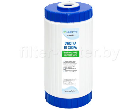 AquaSpring GAC-BB10 — засыпной картридж стандарта Big Blue 10" с начинкой из гранулированного активированного угля. Он предназначен для установки в магистральные фильтры типоразмера BB10" и очистки холодной воды от хлора, хлорорганических примесей, летучих веществ. Картридж служит для улучшения вкуса и запаха воды.